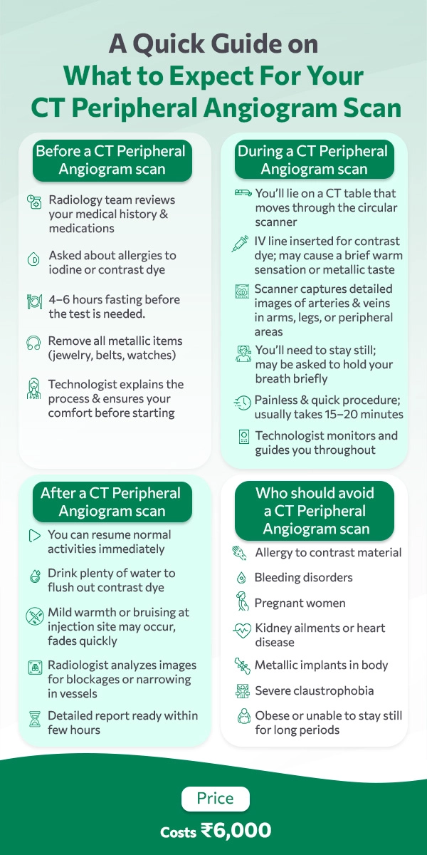 A CT Peripheral Angiogram captures detailed images of the arteries in the arms or legs to detect blockages or narrowing. The scan lasts 20–25 minutes, with a 6-hour report turnaround. The price is ₹6,000, and the radiation exposure is moderate but maintained within safety guidelines.
