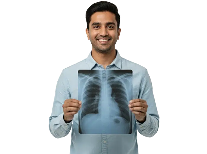 The captured X-ray images will be reviewed by our radiologist to assess your lungs, airways, heart, and chest wall. The report will include findings such as infection, fluid buildup, lung collapse, or heart enlargement, if present.