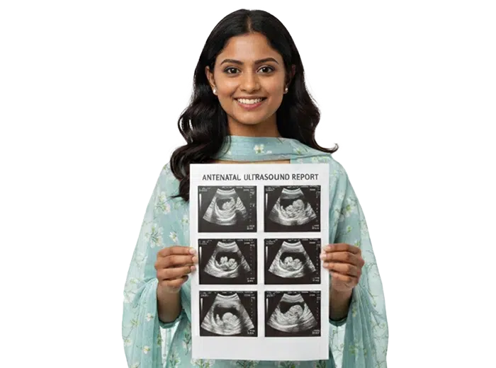 An Antenatal Ultrasound helps track the development of the baby and placenta during pregnancy. The scan lasts 15–25 minutes, and the report is ready in 6 hours. The price ranges between ₹1,000 and ₹1,500, and the test is entirely radiation-free, ensuring the safety of the expecting mother.