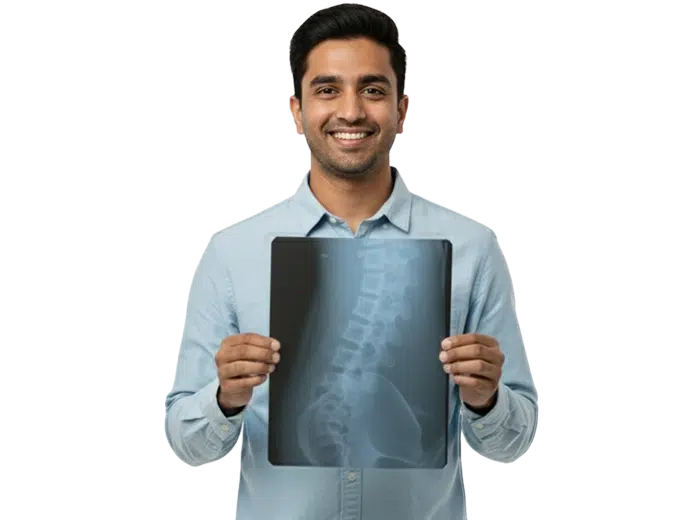 An X-ray Lumbar Spine Lateral View produces a side image of the lower back, helping detect disc problems, arthritis, or injury. The scan takes 5–10 minutes, and the report is issued within 6 hours. It costs ₹275, with low to moderate radiation exposure kept within safe limits.